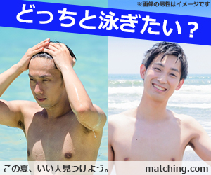 架空のマッチングサイトのバナーです。クリック率を上げるために、バナーの中で二人の男性を比較させるという手法を採用しています。夏らしいさわやかなデザインに仕上げています。