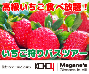 いちご狩りバスツアーのバナーです。いちごのみずみずしさが伝わる素材を選定し、補色でもある赤と緑の2色を使用してまとめました。Megane’sという架空の旅行会社を設定しており、ロゴも自作しました。ロゴの解説は後述。
